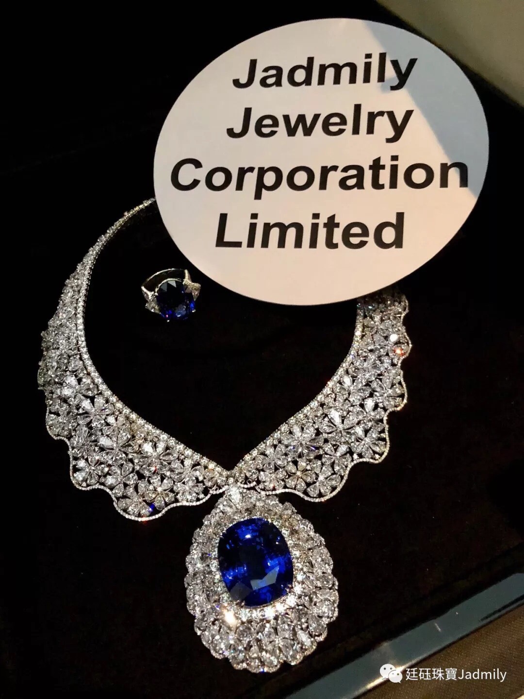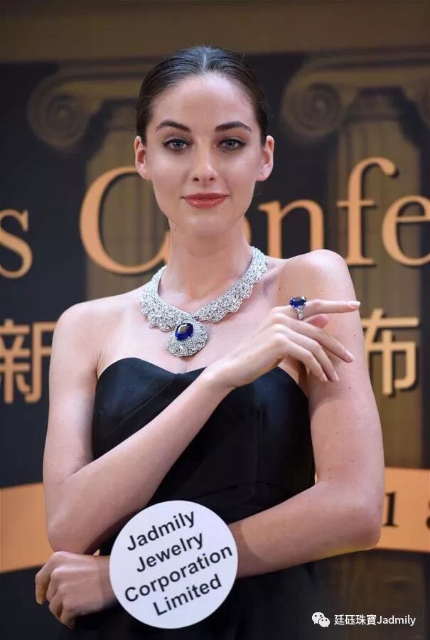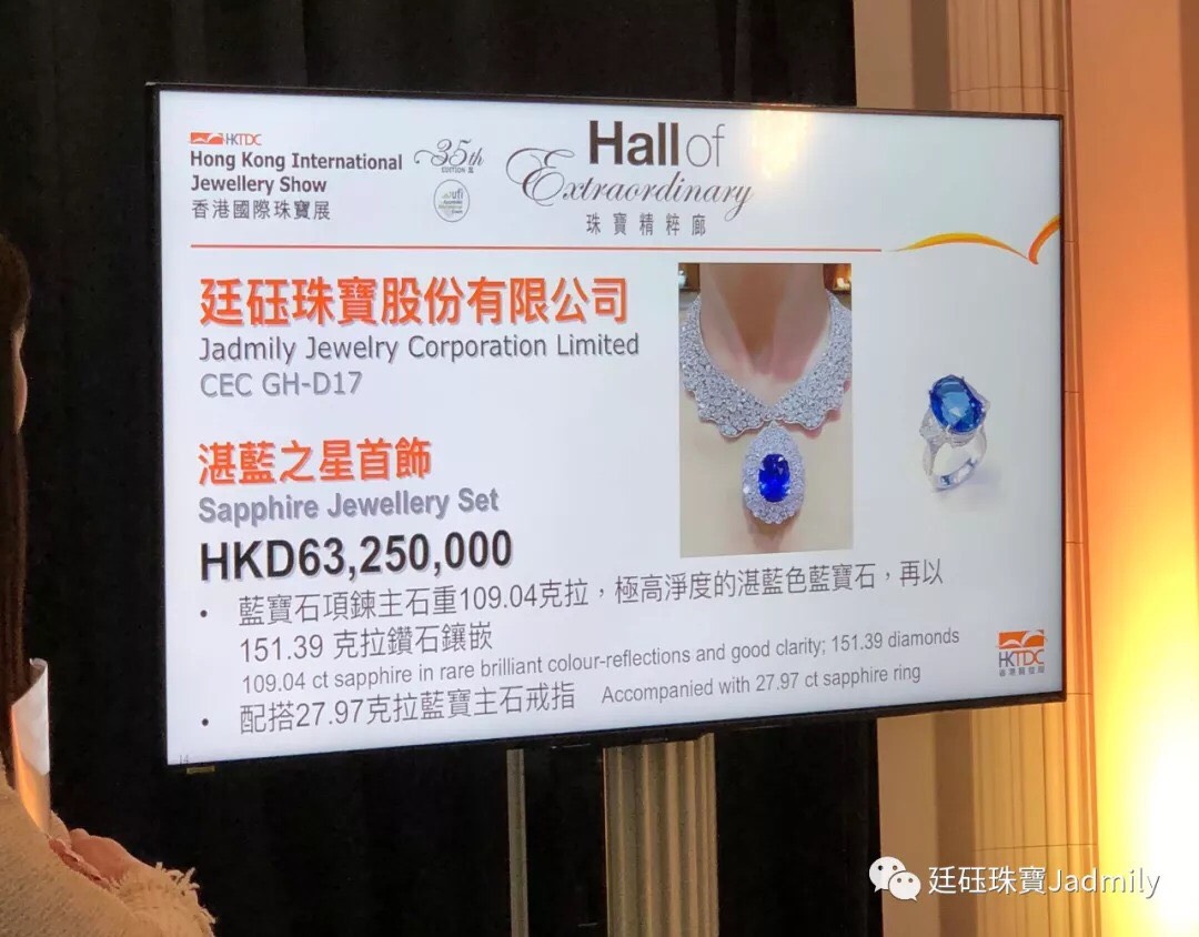 他也特別介紹這次難能一見的珍稀展品,其中以廷砡Jadmily Jewelry所發表的「湛藍之星」藍寶石套鏈令人驚豔,其主石為重達109.04克拉,擁有極高淨度,工藝創作展現歐洲皇室貴族細緻優雅,古典奢華,浪漫氣質,並採用了1638顆總重151.39克拉鑽石鑲嵌,耗時兩年設計製作,充分展現出匠人的堅持與精神。搭配鉑金鑲嵌27.97克拉的藍寶石戒指,售價高達港幣6325萬。